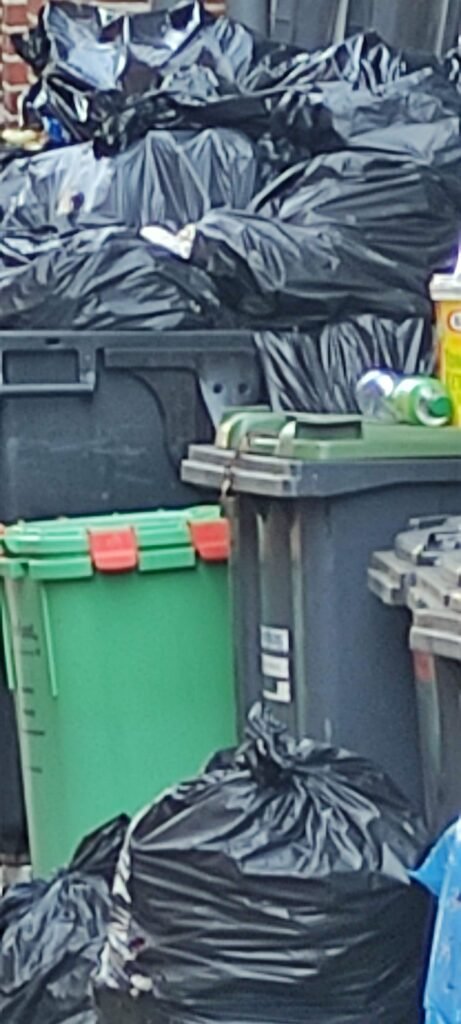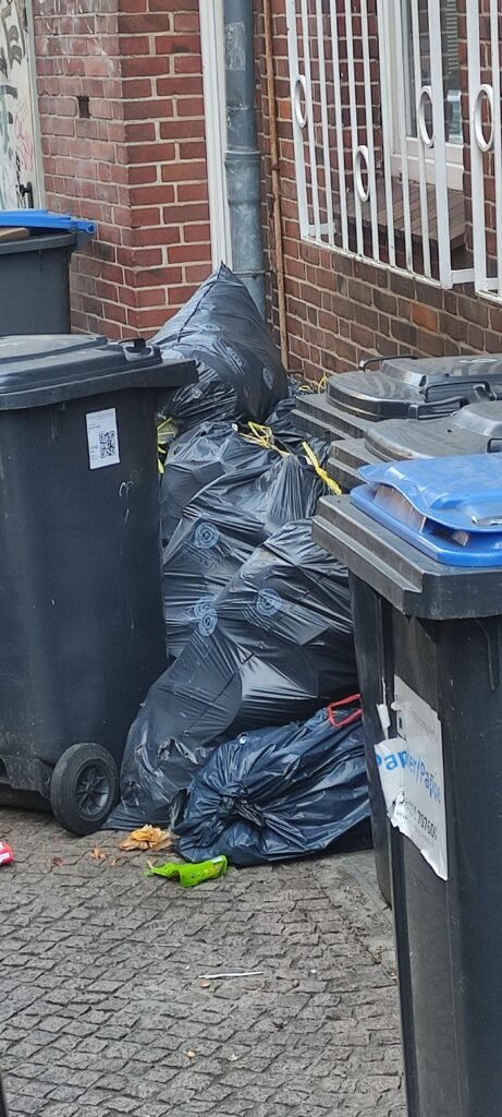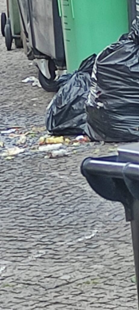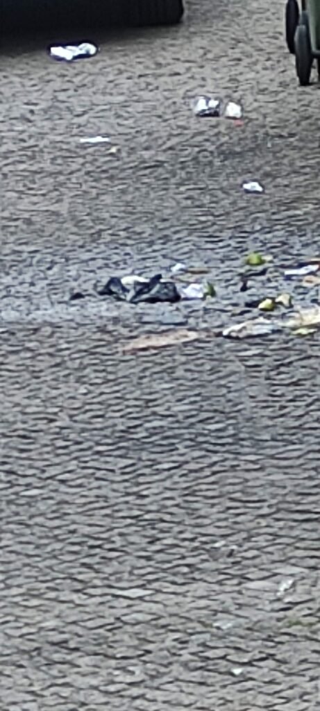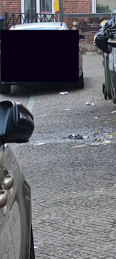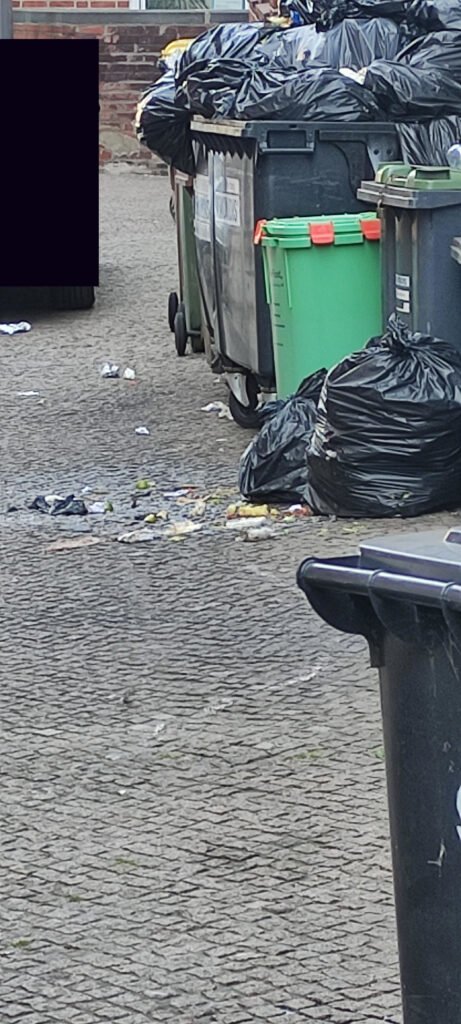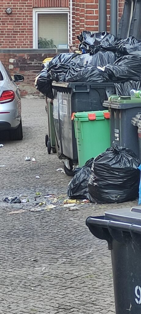An vielen, nicht allen Tagen sieht es auf der Rückseite der Holstenstraße, Petrikirchhof, aus wie auf einer Müllkippe. Es sind viele zusätzliche Mülltonnen für die Gewerbetreibenden Hanoi Flame und den Bubbletea-Laden hinzugekommen; trotzdem quellen diese über, mit übelriechenden Speiserückständen, Ölen, Fetten und anderen Dingen.